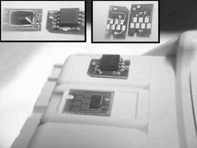 二是墨盒芯片對(duì)位不準(zhǔn)確沒有被打印機(jī)檢測(cè)到。目前國內(nèi)永久芯片沒有一個(gè)統(tǒng)一標(biāo)準(zhǔn),比如芯片的體積大小和厚薄,當(dāng)更換另一種芯片后,由于體積大小和厚薄的不一致,造成打印機(jī)無法檢測(cè)到芯片;還有一些內(nèi)墨盒上芯片放置位置做工上的精確度不高,這樣就或多或少影響到芯片在墨盒上的固定點(diǎn)的精確度;當(dāng)然墨盒標(biāo)準(zhǔn)尺寸不夠也會(huì)造成與打印機(jī)的彈簧接觸點(diǎn)對(duì)位不準(zhǔn),使打印機(jī)無法檢測(cè)到永久芯片(圖13)。
