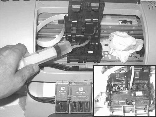 ②拔下軟管,將注射器和軟管清洗干凈,抽取清洗液或者純凈水后再次將軟管插入墨車上噴頭的吸墨柱,輕輕壓入2毫升水,水從墨車下流出,即刻用紙巾將水吸干(圖15)。如果感覺壓入的力量很輕,說明噴頭已通,如果感覺費(fèi)力,再次輕輕壓入2毫升。最后,可以抽取1毫升相同顏色墨水壓入噴頭。